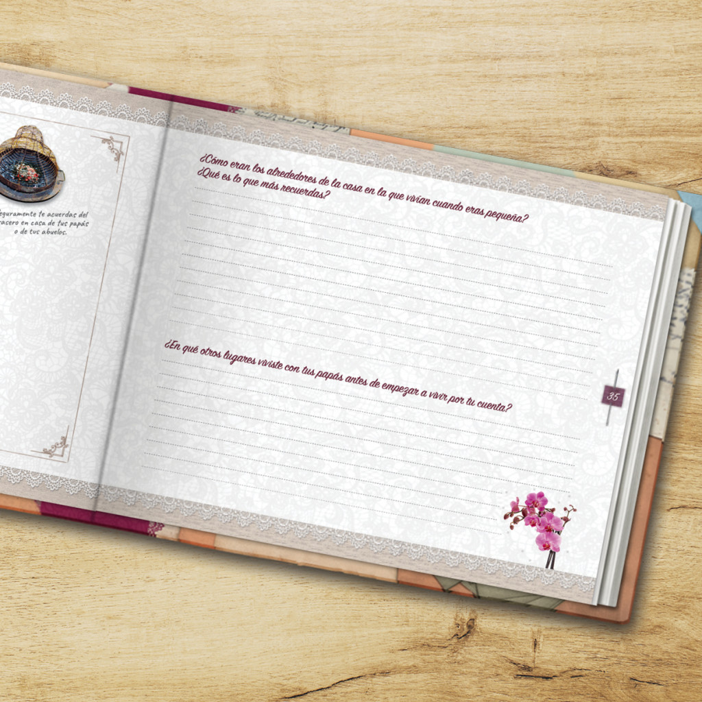 Será una experiencia divertida llenar el libro, que luego se convertirá un testimonio personal de incalculable valor para toda la familia. El formato de 25x30 cm, las tapas duras, el papel de alta calidad y la encuadernación de primera aseguran durabilidad, comodidad al escribir y una lectura placentera en el futuro. Además, el libro incluye imágenes y fotografías de época que te ayudarán a revivir esos recuerdos. También hemos reservado espacio para añadir fotos propias.